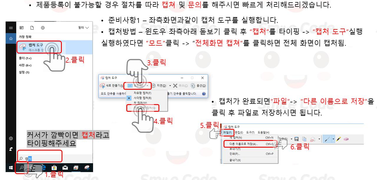 시디키 입력시 제품 코드가 중복이거나 유효하지않은,잘못된 코드일 경우 아래 절차대로 3개의 화면을 먼저 캡처합니다.