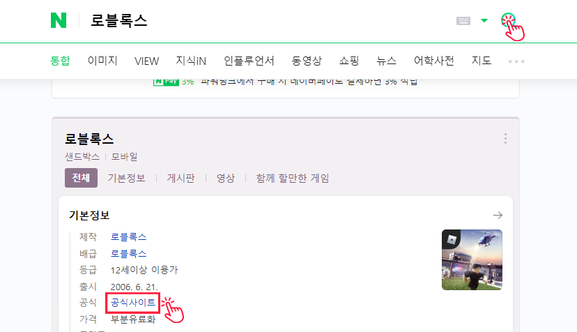 검색창에 '로블록스'를 검색 하시거나 아래링크로 접속 해주세요.