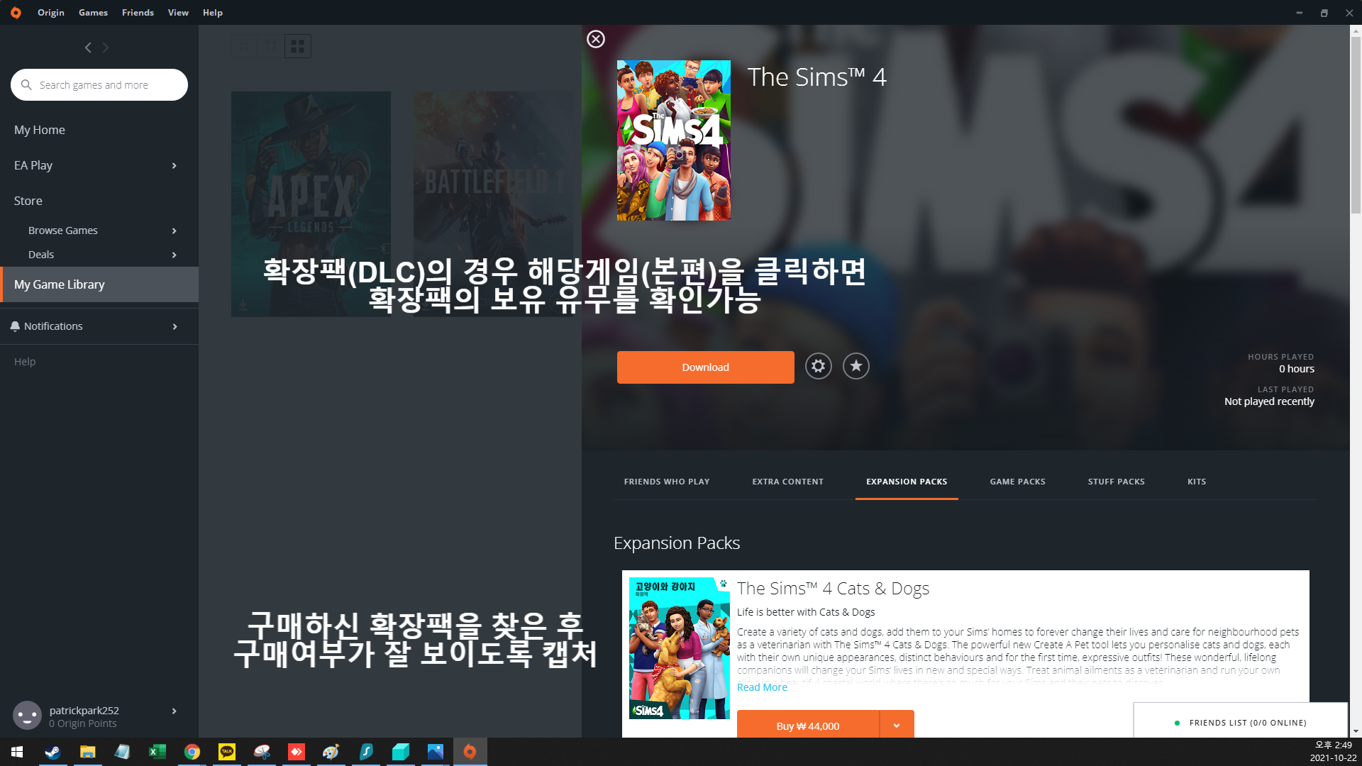 이미 소유한 구매상품의 본편을 클릭 후 구매한 확장팩을 확인하실수 있습니다. 여기서 보유 유무를 확인가능하니 해당화면을 캡처해주세요
