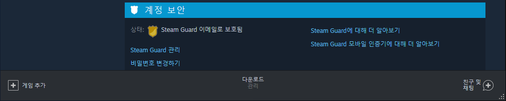 5자리의 인증코드를 인증 창 에 입력하시면 인증완료 본인의 스팀가드 설정을 아래에서 확인해볼게요!!