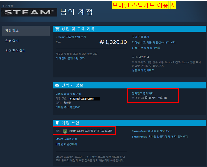 연락처 정보의 등록한 휴대폰에 설치된 스팀어플의 스팀가드 인증기로 인증코드를 확인하실 수 있음