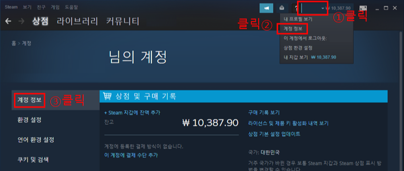 먼저 스팀 로그인 후 우측상단의 아이디를 클릭 후 계정정보를 클릭하시면 됩니다.